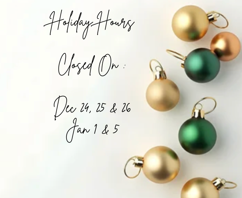 Holiday Hours, Closed On: Dec 24,25 & 26 | Jan 1 & 5